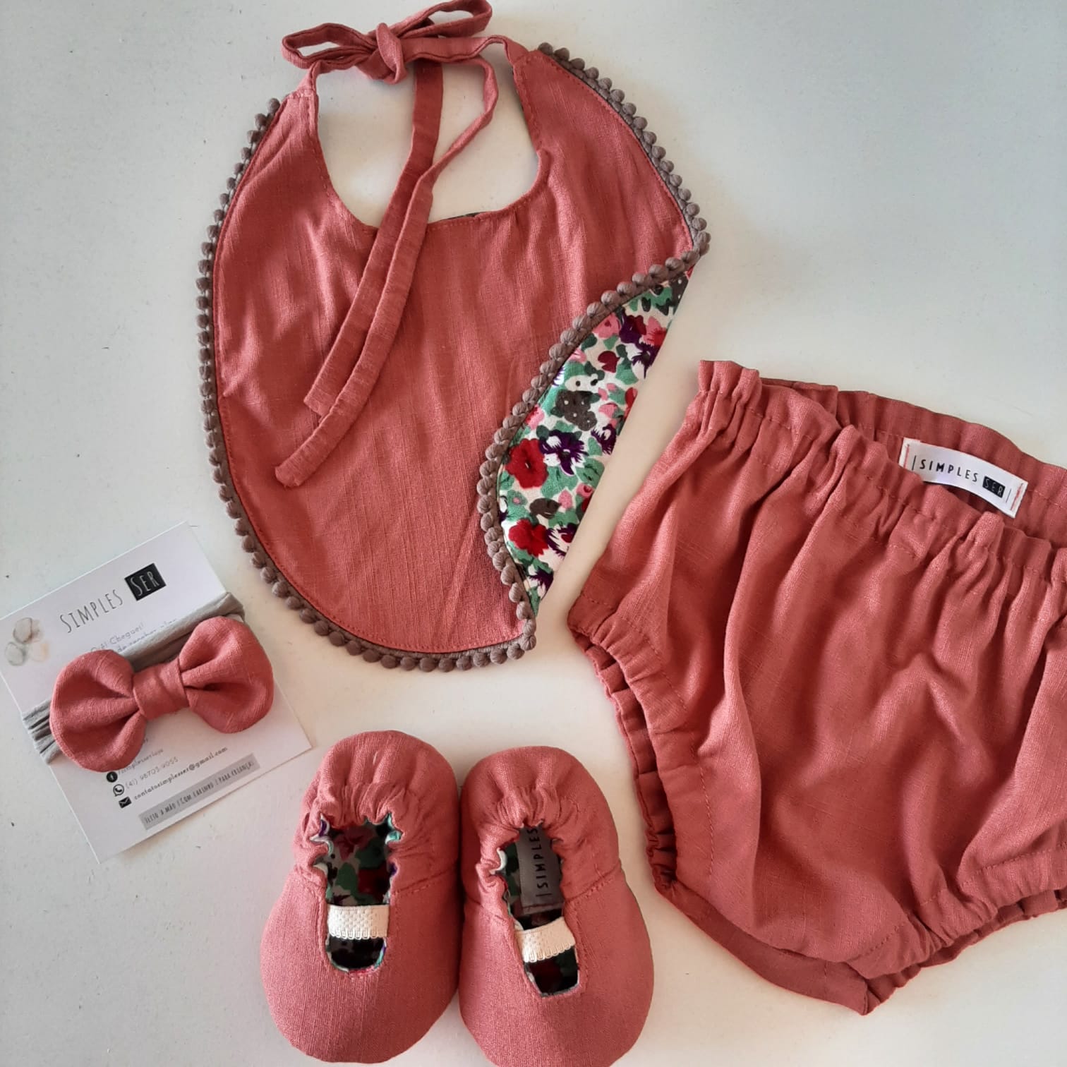O kit Boas vindas é perfeito para presentear aquele bebezinhos que está chegando ou acabou de chegar! Ele é composto de sapatinho, babador/bandana, lacinho e um tapa fraldas.