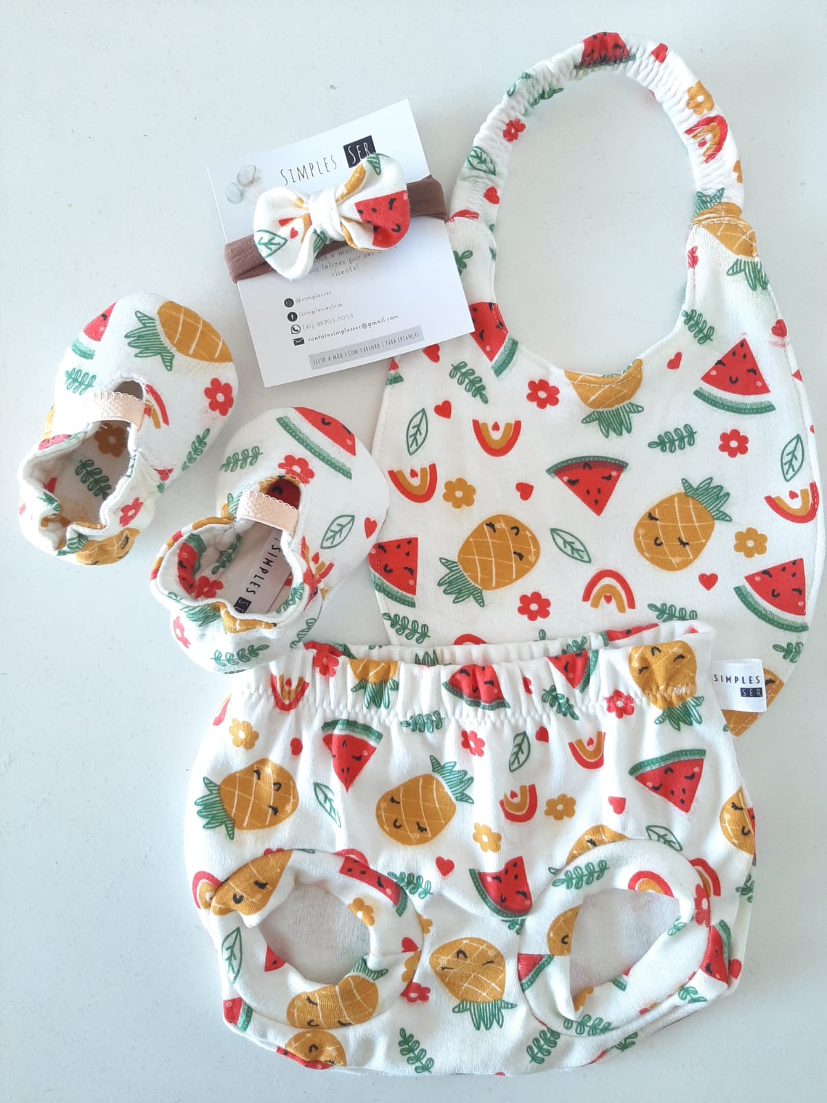 O Kit Boas vindas é perfeito para presentear aquele bebezinhos que está chegando ou acabou de chegar! Ele é composto de sapatinho, babador/bandana, lacinho e um tapa fraldas.